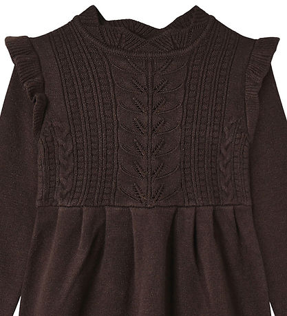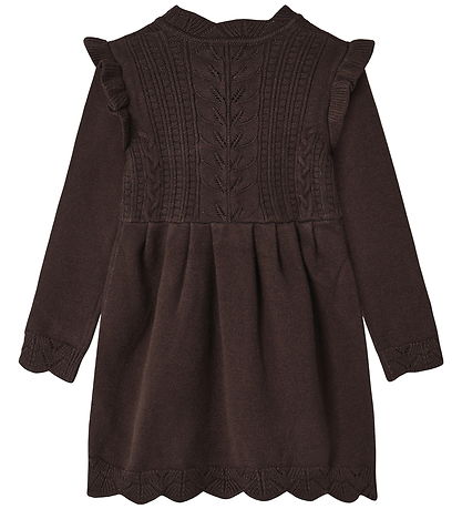 Élégante robe Fliink tricotée dans un brun foncé profond. Fliink présente des manches longues ornées de volants raffinés. Le motif est orné de motifs floraux, de torsades et d'un bord ondulé.