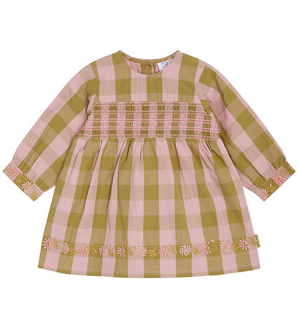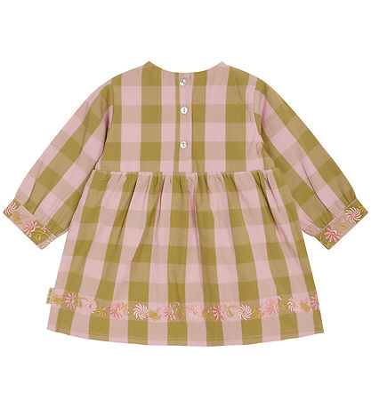 Robe Sweet Hust and Claire avec un joli motif à carreaux dans les tons rose et vert et avec d'adorables broderies florales aux poignets et le long du bas de la jupe.