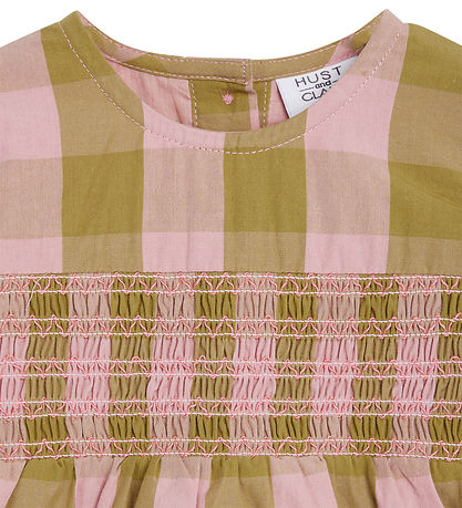 La robe Hust and Claire a des manches longues avec fentes et fermetures bouton et élastiques, qui forment de fins plis. Sous la poitrine, sur le devant, se trouve une pièce élastique smockée à motif zigzag et petits coeurs brodés, qui forme une jupe de bonne largeur et plissée. A l'arrière se trouve une jolie après la fermeture avec des boutons roses. La Robe se compose de deux couches au tissage serré, dont l'intérieur est de couleur rose de couleur unie.