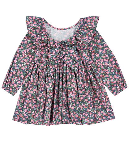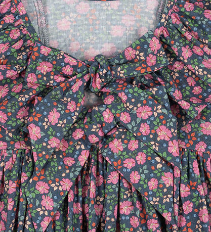 Magnifique robe Konges Sløjd bleu foncé à imprimé floral coloré. Konges Sløjd présente des manches longues et d'élégants volants aux épaules, ajoutant une touche d'élégance. Robe arbore un joli décolleté en V et un joli noeud papillon appliqué dans le dos.