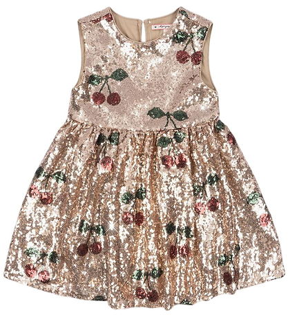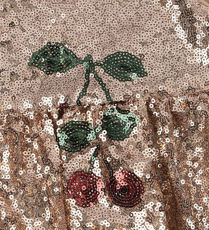 Ravissante robe Konges Sløjd ornée d'un superbe motif à paillettes roses. Robe magnifique motif cerises aux tons rouges et verts met en valeur le fond doré. Sans manches, elle présente une tour.