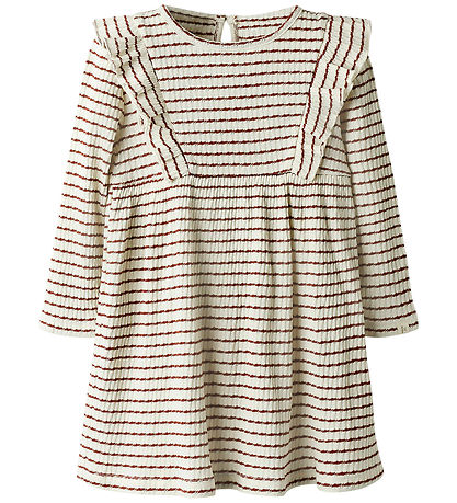 Robe Lil' Atelier Lil' Atelier, ivoire blanc à a rayures horizontales bordeaux. robe présente des manches longues et de charmants volants aux épaules. Sa structure légèrement côtelée lui confère une belle texture.