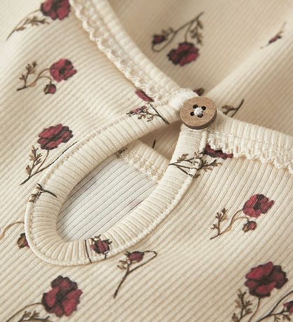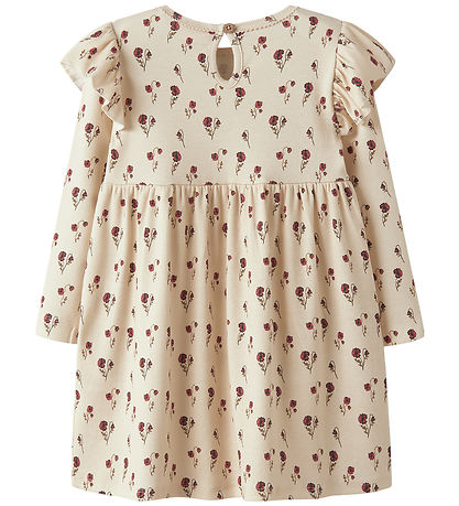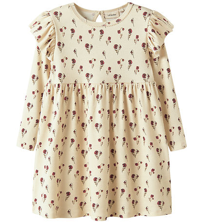 Jolie robe Lil' Atelier Lil' Atelier crème avec un imprimé floral rouge et une structure côtelée. robe présente une encolure tour ornée de jolies surpiqûres et d'un bouton. Robe possède des manches longues avec des volants aux épaules. Elle est coupée sous la poitrine et présente des fronces qui lui confèrent une belle ampleur.
