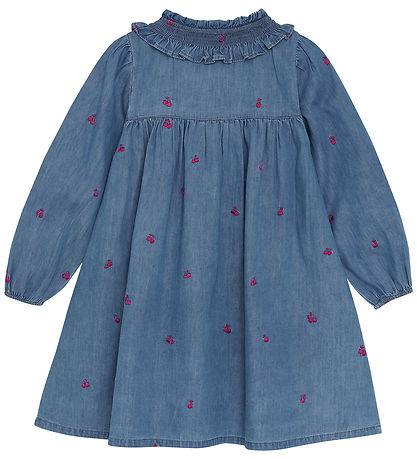 Élégante robe Minymo en denim bleu ornée de cerises rouges brodées. Confectionnée dans un tissu léger et serré, Robe est idéale pour les soirées d'été.
