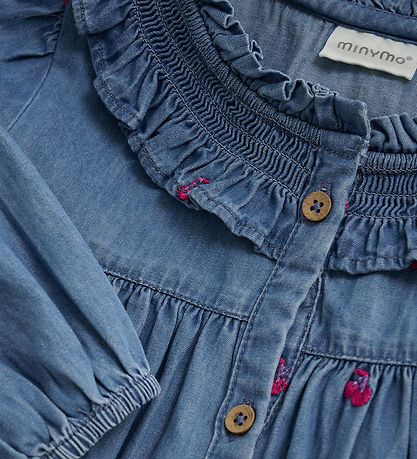La robe Minymo a des manches longues, une fermeture boutonnée sur le devant et un joli col à volants.