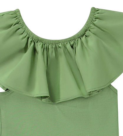 La robe Molo est sans manches et possède de larges bretelles, qui sont cachées par un large volant tout autour du cou. Dans le corps, la robe a une fine structure côtelée, elle est donc bien ajustée. La jupe a une bonne largeur et de jolis plis, et la robe est dans un coton de belle qualité avec une bonne élasticité au niveau du corps.