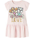 Robe Nice Name It à manches courtes de couleur rose tendre. La Robe présente un imprimé coloré des personnages Skye et Everest de Paw Patrol, ainsi que du texte et des détails floraux sur le devant.