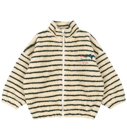 Veste polaire Smart Konges Sløjd en polaire pilou de couleur crème avec a rayures horizontales vert foncé. Sur la poitrine gauche et dans le dos se trouve un dragon brodé en vert, bleu et rouge.