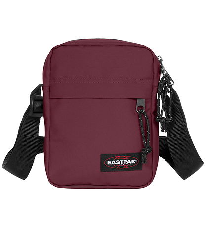 Joli sac à bandoulière Eastpak de couleur bordeaux de couleur unie avec un patch logo sur le devant aux couleurs originales de la marque ; rouge, blanc et noir.