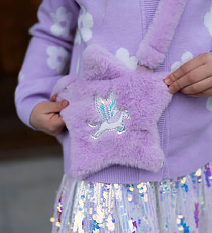 Charmant sac sac à bandoulière Great Pretenders en faux cuir fourrure violet clair, orné d'un délicat imprimé pégase sur le devant. Great Pretenders forme étoilée et sa longue bandoulière lui confèrent un look unique.