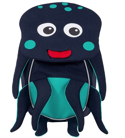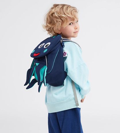 Joli sac à dos Affenzahn en marine et vert en forme de calamar. Devant il y a deux grandes bouches et une bouche qui étend la langue. La languette est fixée à l'aide d'un élastique et lorsque vous la tirez, une étiquette nominative apparaît.