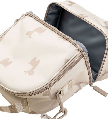 sac isotherme Fin Done by Deer beige avec un imprimé complet de petites girafes beige.