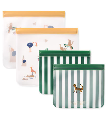 sachet de nourriture pratiques Liewood vendus en 4 Pack en deux tailles différentes, dont certains sont en vert à a rayures et en jaune moutarde avec imprimé safari.