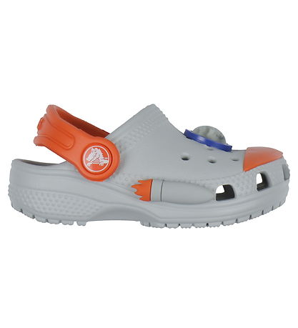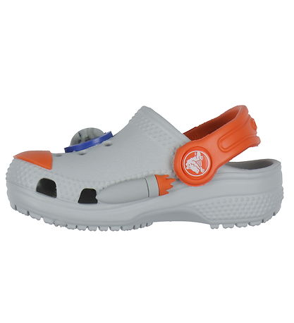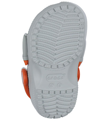 Jolies sandales Crocs grises et orange avec des détails Rum sympas et des applications Rum sur le dessus du pied avec des étoiles à l'intérieur qui brillent dans le noir.