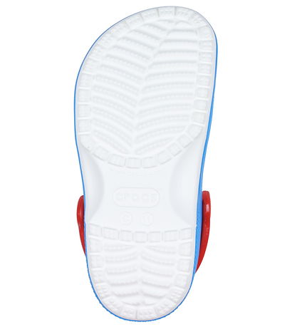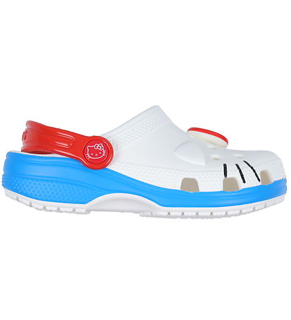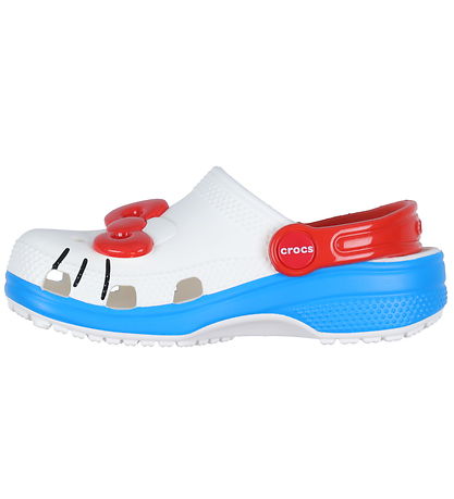 Jolies sandales Crocs en blanc, bleu et rouge avec un joli imprimé de moustaches sur le côté et d'oreille sur le dessus avec un noeud papillon rouge pour faire semblant d'être Hello Kitty. À l'extérieur se trouve un petit logo en rouge et blanc.