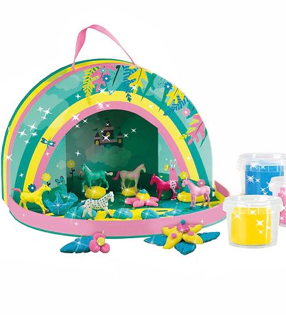 Magnifique boîte de jeu SES Creative. Avec la boîte à jeux, il est possible de créer son propre monde équestre. Utilisez de la pâte à modeler pour réaliser les plus belles fleurs, papillons, rochers et plantes.
