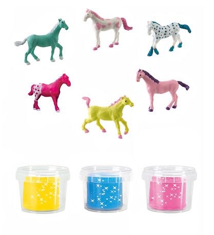 Le coffret contient un coffre à jouets, 6 chevaux et 3 seaux de cire à modeler pailletée.
