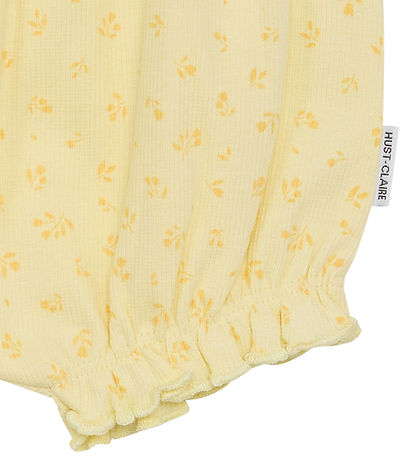 Short Sweet Hust and Claire de couleur jaune clair avec un imprimé de petites feuilles d'un jaune plus foncé avec une fine structure côtelée.