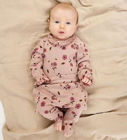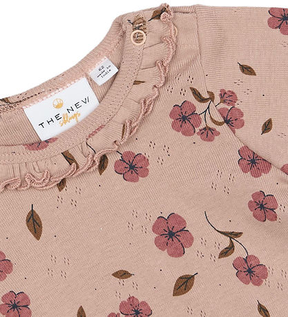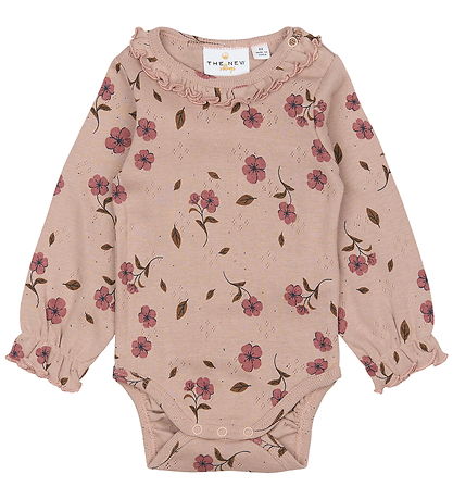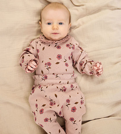 Adorable body rose cendré The New Siblings, orné d'un pointelle pointelle. Le body est également orné d'un imprimés imprimé fleurs et d'un borde à volant décoratif le long de l'encolure ronde, tout comme les manches longues, qui sont finies par un élastique et un borde à volant.