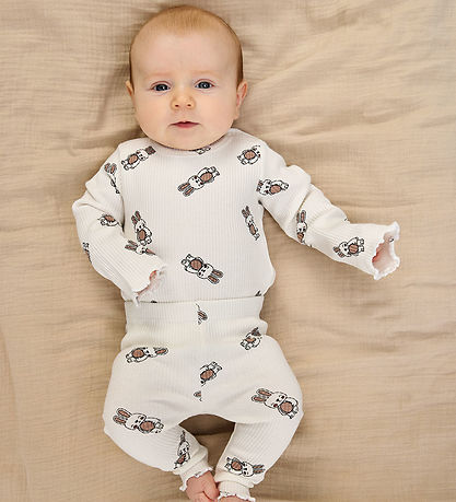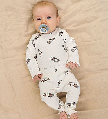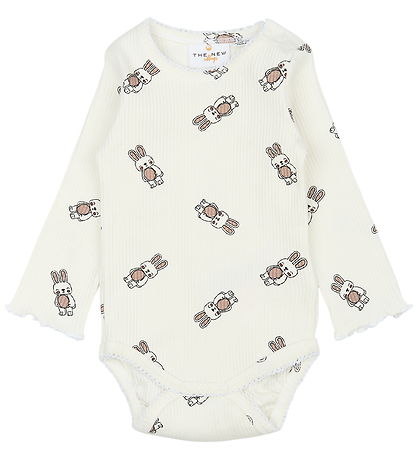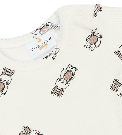 Adorable body The New Siblings blanc cassé à la jolie structure côtelée. Le body est orné d'un fin imprimé lapin et ses manches longues sont rehaussées d'un joli bord ondulé. Le body se ferme par À boutons poussoirs pratiques sur l'épaule gauche et entre les jambes.