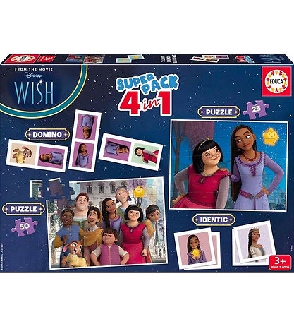 Fantastique puzzle Educa avec 2 puzzles différents, 1 jeu de domino et 1 jeu de mémoire. Tous inspirés du film « Wish » de Disney.