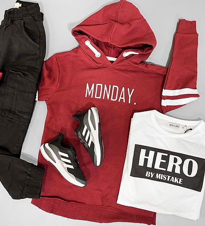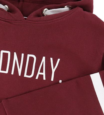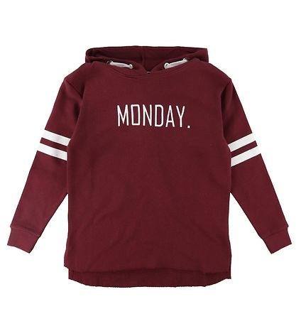 sweat à capuche à capuche Cool Add to Bag bordeaux avec rayures blanches imprimées sur les bras et imprimé « MONDAY » blanc sur le devant.
