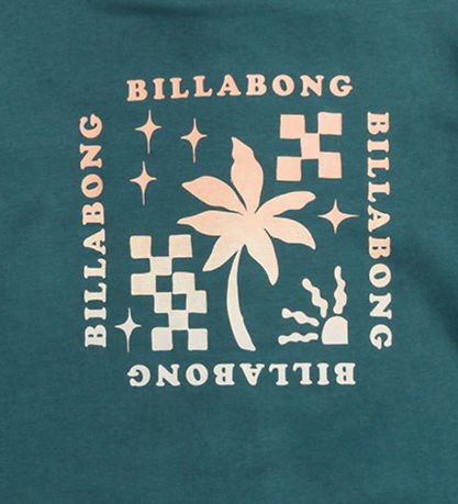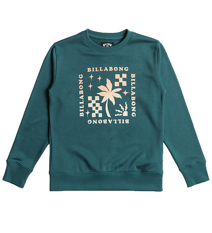 Sweat-shirt Smart Billabong dans une jolie couleur pétrole avec un imprimé audacieux sur la poitrine. L'imprimé montre un palmier, des étoiles et des motifs carrés, entourés plusieurs fois du mot «Billabong» dans une couleur vive et contrastée.