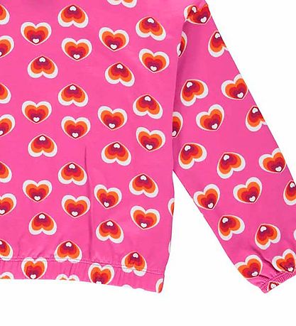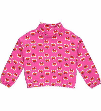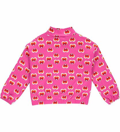 Magnifique sweat-shirt Freds World rose avec un imprimé complet de coeurs en blanc, orange et rouge.