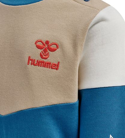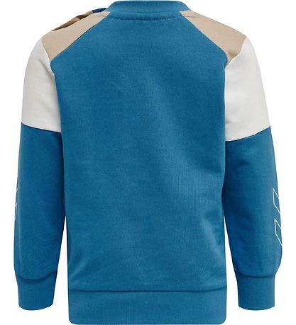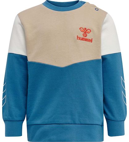 Joli sweat-shirt Hummel bleu, beige et blanc avec un logo orange brodé sur la poitrine gauche. Au bas des côtés extérieurs des manches se trouvent des imprimés non remplis d' chevrons Hummel classiques en blanc.