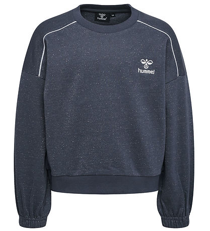 Magnifique sweat-shirt Hummel vieux bleu avec des argent brillant et avec un fin imprimé logo sur la poitrine et un passepoil blanc décoratif sur les épaules.