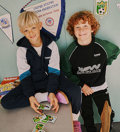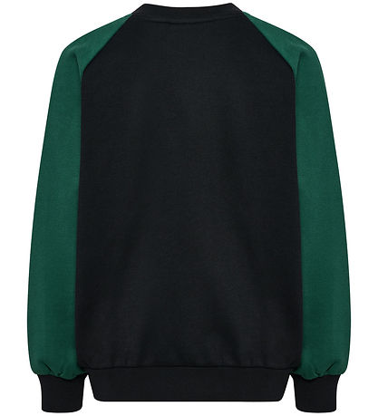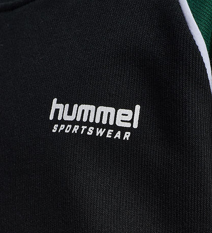 Sweat Hummel élégant noir avec manches vert foncé et passepoil blanc. Grand imprimé blanc sur le devant. Manches longues et larges bords côtelés.