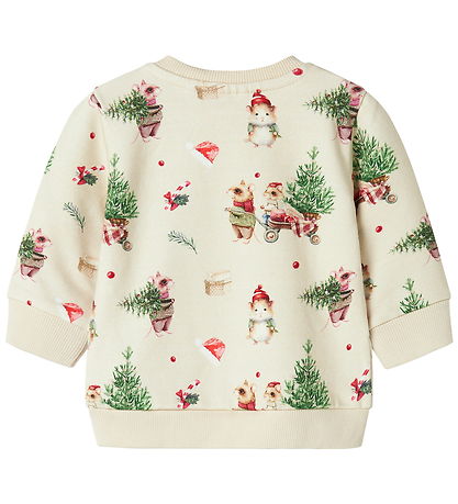 Charmant sweat Name It orné d'un adorable imprimé de Noël représentant des petits animaux portant des sapins. De couleur beige clair, il possède des manches longues et une encolure tour.