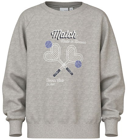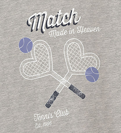 Charmant sweat Name It gris chiné, orné d'un imprimé représentant deux raquettes de tennis en forme de cœur et de l'inscription « Match Made in Heaven ». Ce Name It intègre également des détails tels que «Tennis Club Est. 1996 », qui lui confèrent une allure unique. Des manches longues et un tour complètent ce modèle.