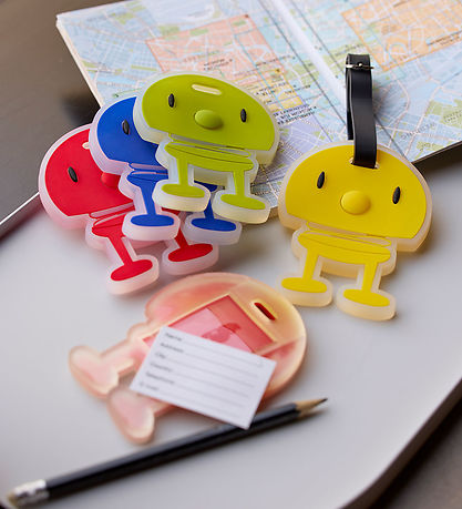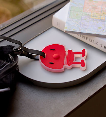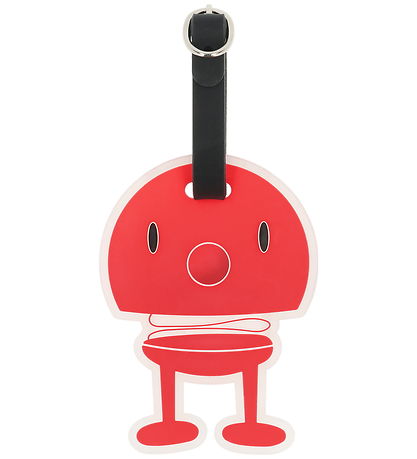 Étiquette de bagage Smart Hoptimist rouge avec le motif familier. Hoptimist est dotée d'une sangle noire pratique et d'un champ d'information clair.