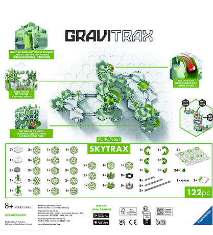 GraviTrax Skytrax vous permet de construire des circuits à billes pleins d' action et de figures palpitantes. Avec le Skytrax et les éléments du coffret, vous avez tout le nécessaire pour faire tomber les billes à travers les pierres, les attraper ou construire des ponts et des tours. Combinez rails et tours pour créer des circuits à billes uniques.