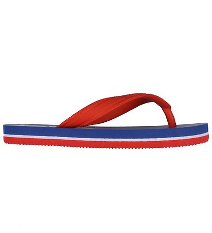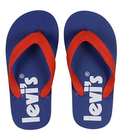 Jolies tongs Levis bleu avec "Levis" imprimé en blanc sur la semelle. Le bracelet est d'un joli rouge.
