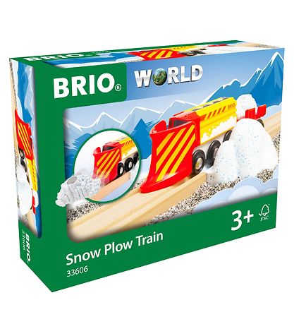 Le ensemble BRIO comprend un train avec chasse-neige, un wagon avec support amovible pour la neige ou d'autres objets, ainsi qu'une piste à neige en plastique et une motte de neige à déplacer sur les rails.
