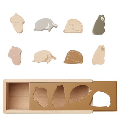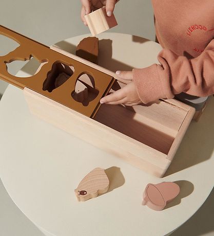 Fantastique trieur de forme Liewood composé de 10 parties aux couleurs calmes et naturelles. La boîte elle-même est en bois avec un couvercle en caramel doré.