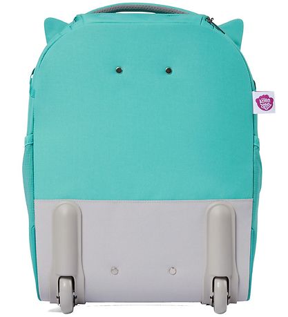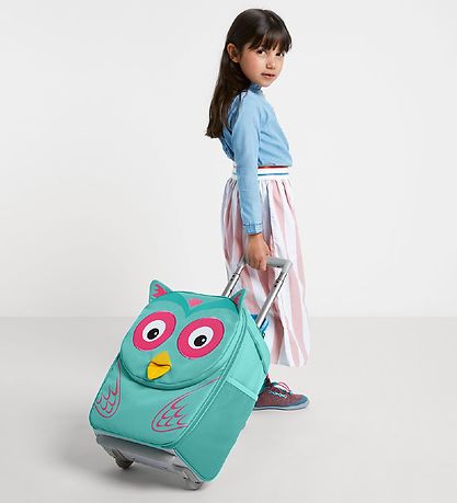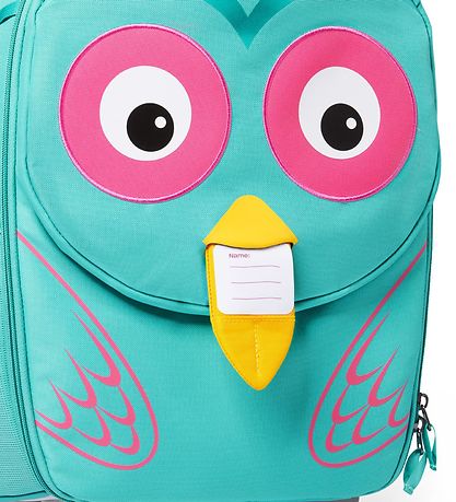 trolley Sweet Affenzahn couleur pétrole avec détails rose et jaunes en forme de hibou. Devant, il y a une paire' yeux noir et blancs et un bec jaune. Le bec est attaché avec un élastique, et lorsque vous le tirez, une étiquette nominative apparaît.