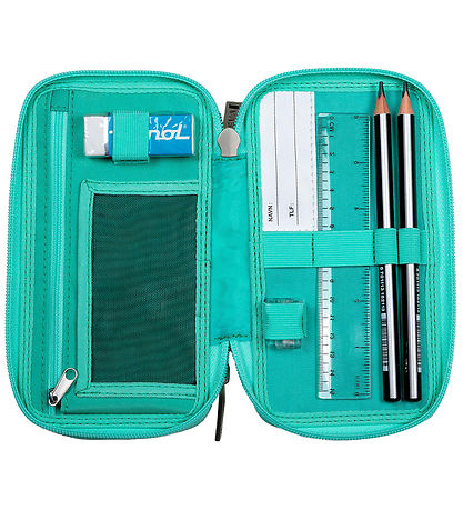La Trousse comporte deux compartiments qui s'ouvrent tous deux par une fermeture éclair. Un compartiment est doté d'une étiquette nominative et de nombreuses sangles élastiques pour garder une trace des douze crayons de couleur épais. Le deuxième compartiment est doté d'une étiquette nominative, d'une poche zippée et d'une poche en filet noir pour le formulaire scolaire ainsi que de sangles élastiques pour garder une trace de la gomme, du taille-crayon, de la règle et des deux crayons épais.