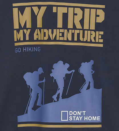 T-shirt Nice Color Kids de couleur marine, avec sur le devant un grand imprimé bleu avec des randonneurs. Au-dessus, il est écrit «My Trip My Adventure » en marron.
