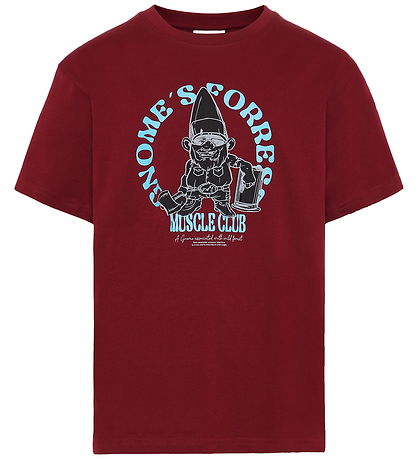 T-shirt Smart Grunt rouge foncé avec un grand imprimé sur le devant représentant un gnome gris foncé et un texte bleu tout autour. Ce T-shirt possède une encolure tour à bord côtelé fin et des manches courtes.