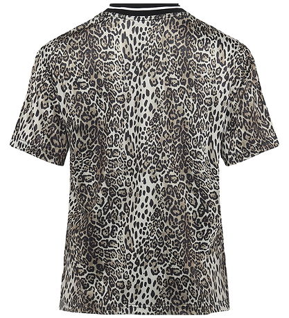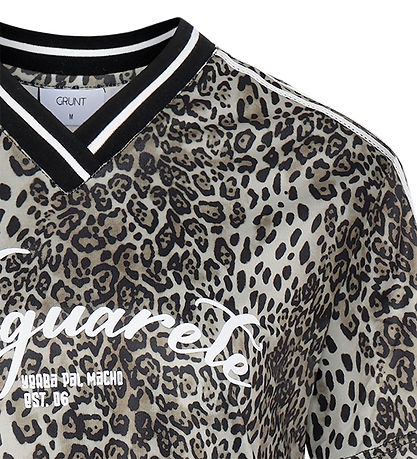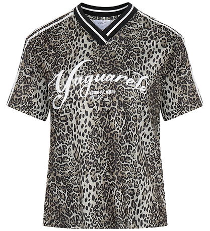 Magnifique t-shirt Grunt à imprimé léopard dans des tons marron et noir. T-shirt arbore un imprimé blanc distinctif sur la poitrine avec le texte « Yaguarete » et deux rubans blancs bordés de dentelle ornent les épaules. Ce t-shirt Grunt présente un col en V à bord côtelé et des manches courtes.