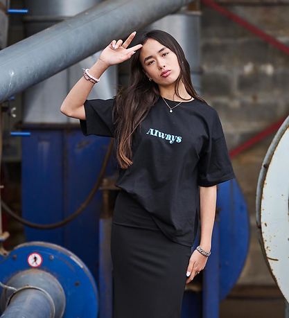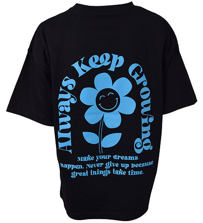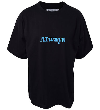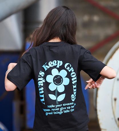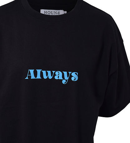 t-shirt Nice Hound noir, avec le mot "Always" imprimé en bleu clair sur le devant. Au dos se trouve un grand imprimé en bleu clair représentant un tournesol et un texte.