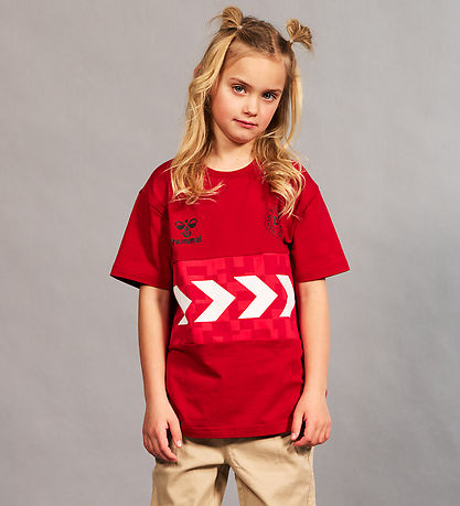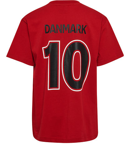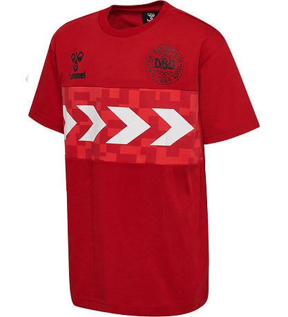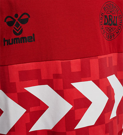 Joli t-shirt Hummel de couleur rouge, avec une bande sous la poitrine d'un imprimé rouge avec des chevrons blancs. Sur la poitrine, il y a une imprimé noir du logo Hummel et de l'insigne de DBU, et sur le dos il y a une imprimé noire de « Danemarque 10 ».