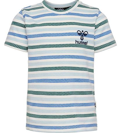 t-shirt cool Hummel en blanc avec a rayures bleu et vert, et sur le côté gauche il y a un petit logo marine.