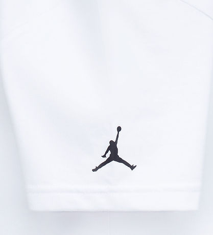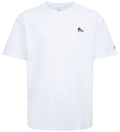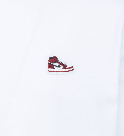 T-shirt Jordan Smart blanc orné d'une petite applique représentant une chaussures Nike Jordan rouge, blanche et noire sur le côté gauche de la poitrine. Ce T-shirt présente une encolure tour avec un bord côtelé fin et des manches courtes.