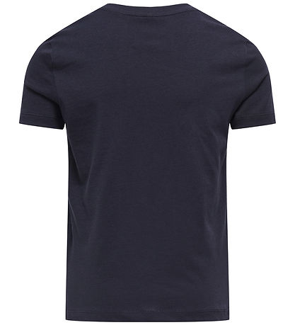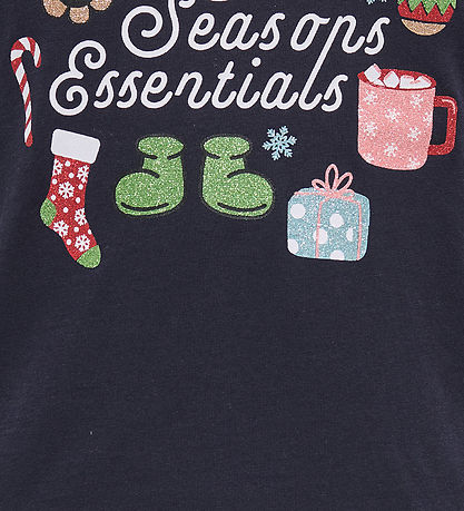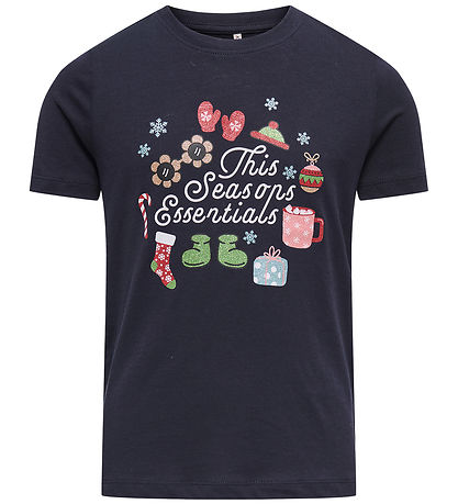 Adorable t-shirt Kids Only bleu marine orné d'un joli imprimé de Noël avec texte et motifs tels que des moufles, des chaussettes, des boîtes cadeaux et des flocons de neige brillant. Ce t-shirt Kids Only présente une encolure tour classique avec un bord côtelé fin.