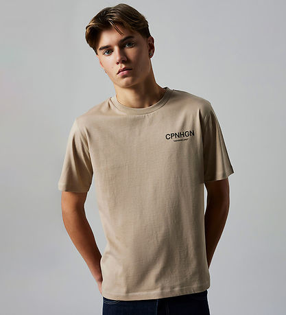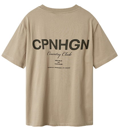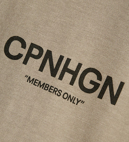 Élégant t-shirt LMTD marron clair avec imprimé sur la poitrine gauche : « Réservé aux membres CPNHGN » en brun foncé profond. Un grand texte similaire est également imprimé au dos. Ce t-shirt LMTD présente une encolure tour à bord côte fin et des manches courtes.