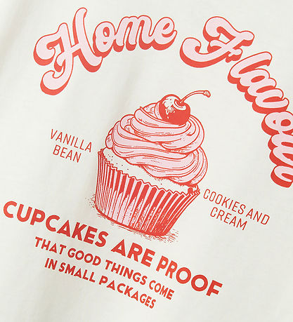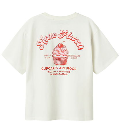 Élégant t-shirt Name It d'un blanc immaculé. T-shirt est orné d'un imprimé rouge sobre au centre, avec l'inscription « Home Flowers », et d'un grand imprimé cupcake rose au dos. Ce t-shirt Name It présente une encolure tour classique avec un bord côtelé fin pour une coupe classique.